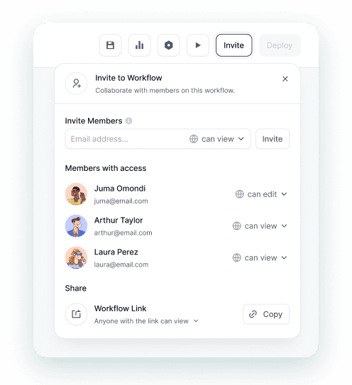 Configure connectors, tweak AI prompts, adjust branching logic, and more — right from our intuitive visual builder. Zero dev time required.